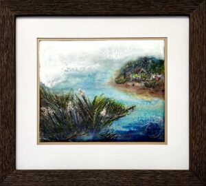 Description: Painted in archival encaustic wax and then carved in to emphasize the texture of the grasses in the foreground, the clothes sundrying and the corrugated zinc roofing, this nostalgic piece draws from the artist’s childhood memories of village life in south Trinidad; simple wooden houses with rusty roofs, hens with their chicks in tow, a clothesline in the backyard.